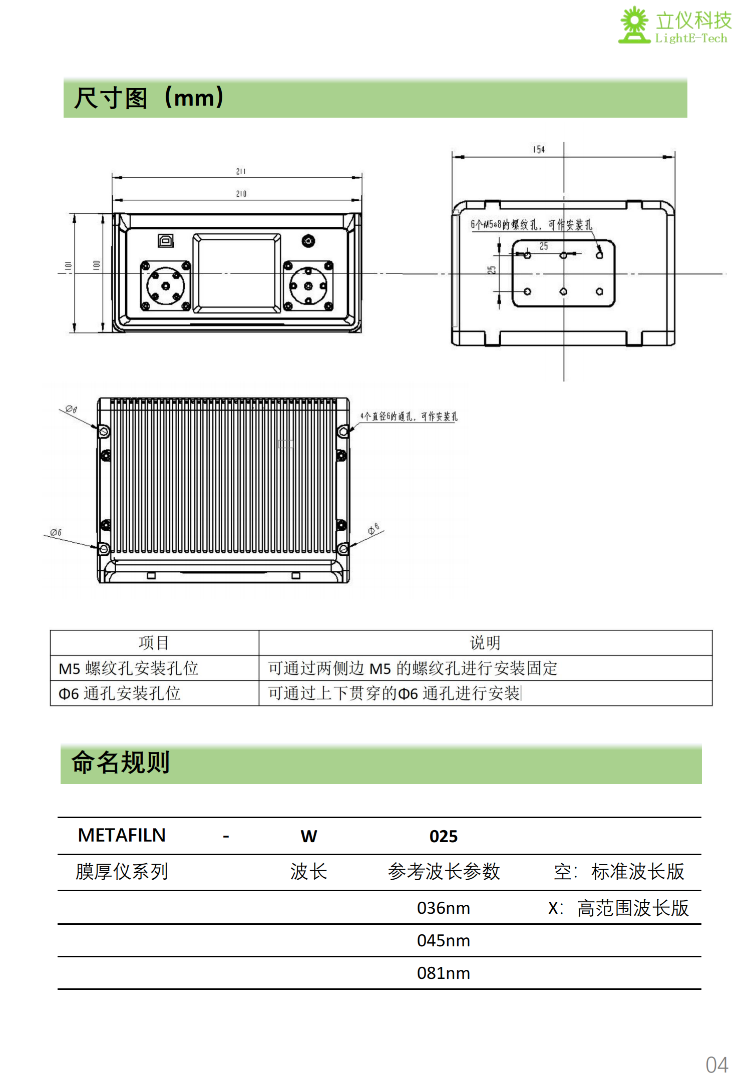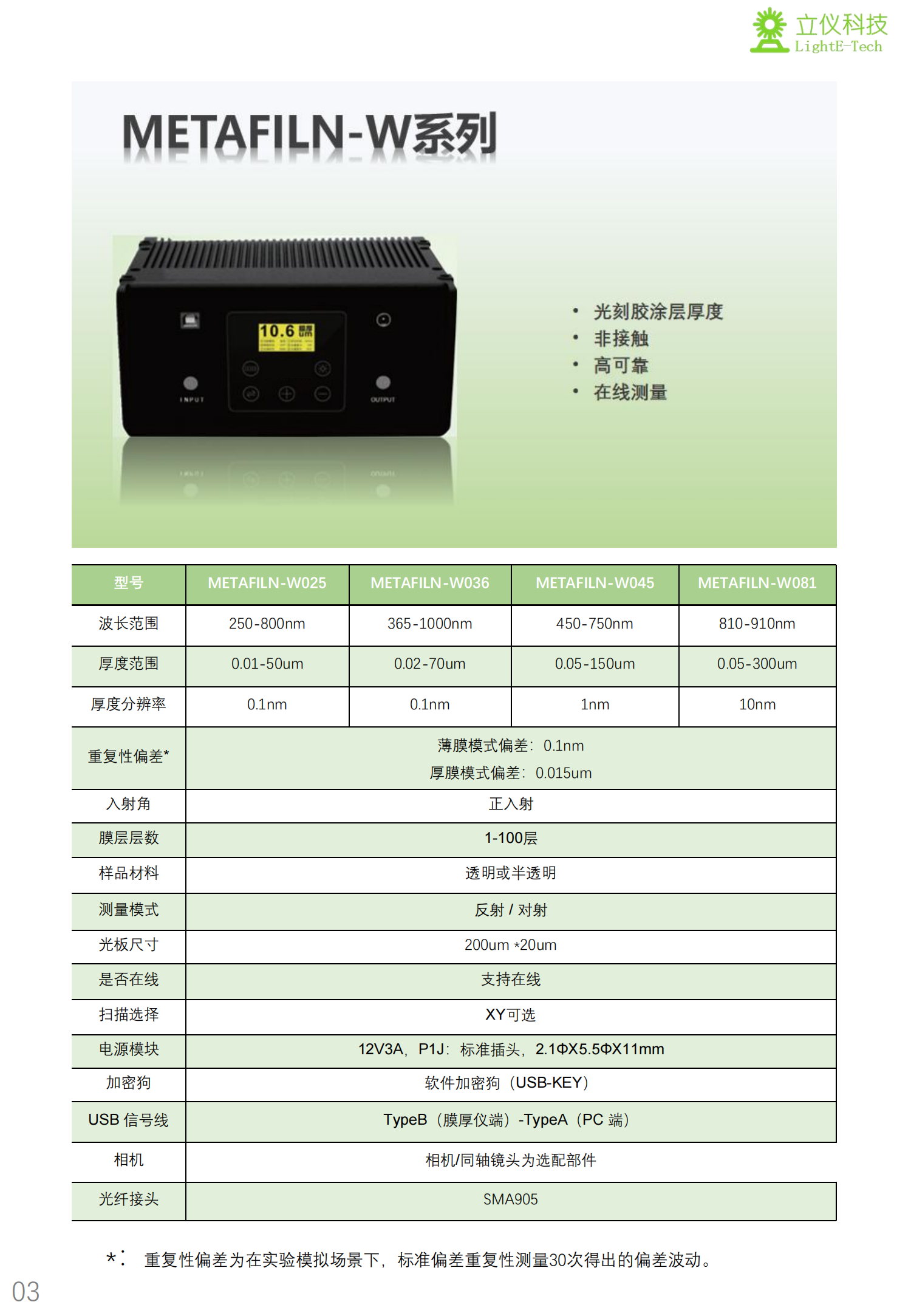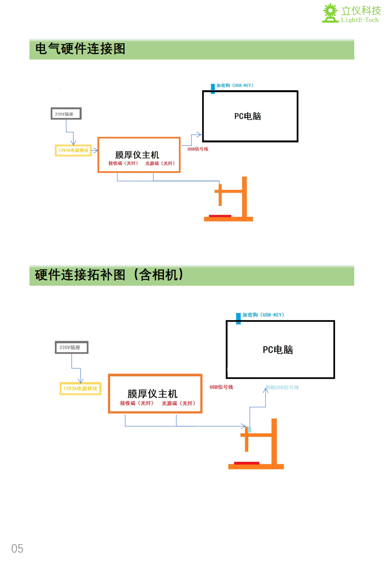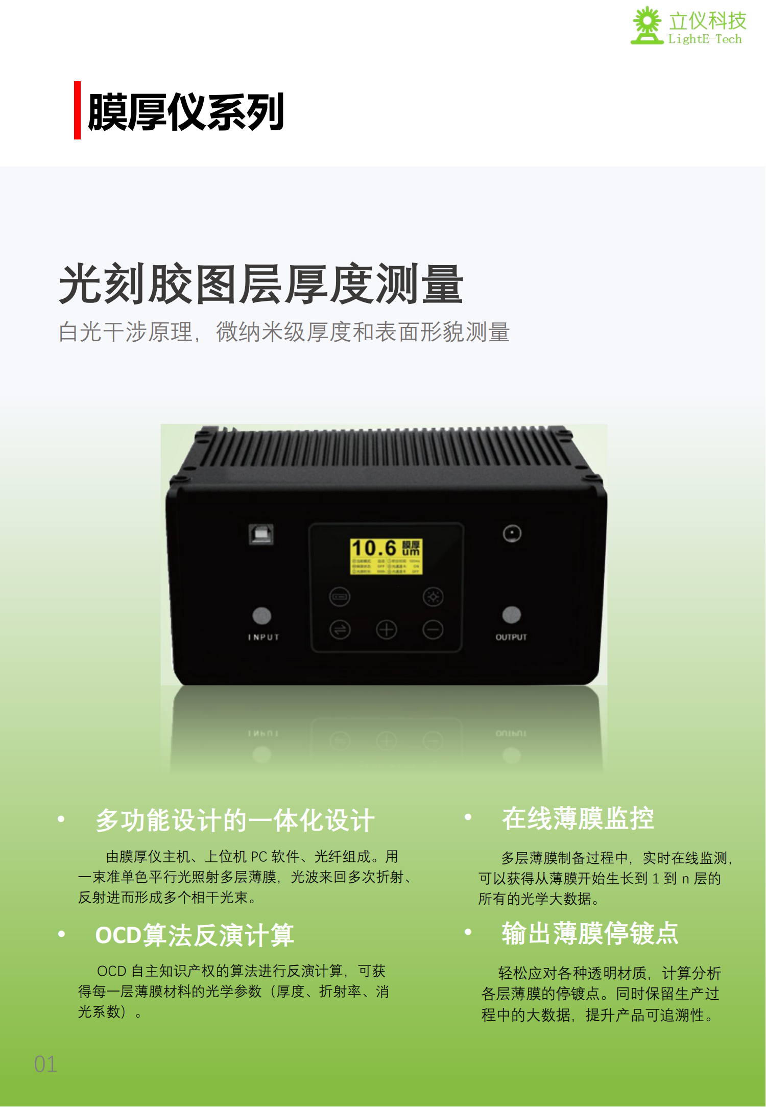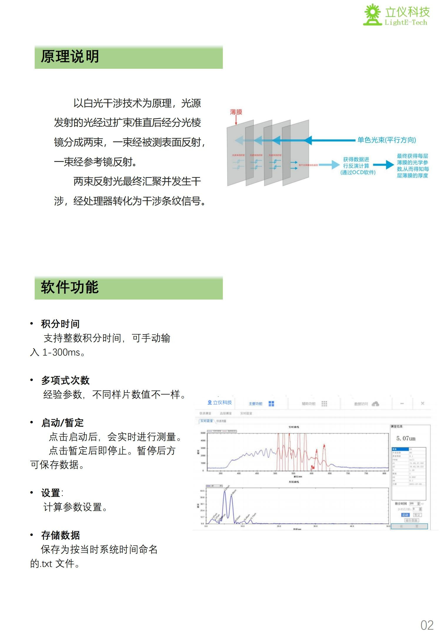 該產品由膜厚儀主機、上位機 PC 軟件、光纖組成。用一束準單色平行光照射多層薄膜, 光波會在第 1 到 n 層之間來回多次折射、反射進而形成多個相干光束。這些相干光束進行相 干疊加后,攜帶多層薄膜的相干信號并沿原路返回。不同波長的準單色光照射薄膜后,攜帶 的干涉信號不一樣。如果用一束含有多種波長的準單色光照射薄膜后,提取各個波段的干涉 信號,通過 OCD 自主知識產權的算法進行反演計算,便可獲得每一層薄膜材料的光學參數 (厚度、折射率、消光系數)。