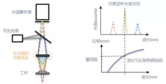 當被測物處于測量范圍內某一位置時,只有某一波長的光聚焦在被測面上,該波長的光由于滿足共焦條件,可以從被測物表面反射回光纖耦合器并進入光譜儀,而其他波長的光在被測物面表面處于離焦狀態,反射回的光在光源處的分布遠大于光纖纖芯直徑,所以大部分光線無法進入光譜儀。通過光譜儀解碼得到光強最大處的波長值,從而測得目標對應的距離值。由于采用了共焦技術,因此該方法具有良好的層析特性,提高了分辨力,并且對被測物特性和雜散光不敏感。
