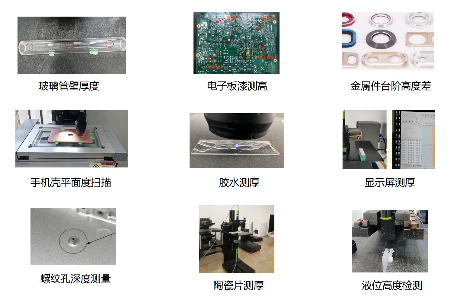 可完成對鏡面、透明、高反光等幾乎所有材質的高精度檢測,廣泛應用于玻璃、電子、金屬、陶瓷等行業,測量物體的高度、厚度、段差、平面度及輪廓等。