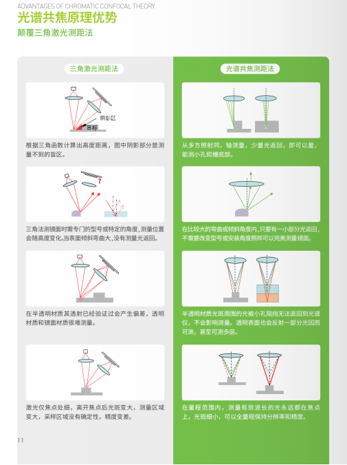 光譜共焦傳感器通過白光光源發射一束寬光譜光,光線經過微型色散鏡頭后分解成不同波長的單色光,每種顏色的光對應一個特定的高度位置;當其中某種顏色的光聚焦在被測物表面并反射回傳感器時,系統便能準確計算出該顏色對應的距離,從而得出物體表面的精確位置信息。 這一過程無需物理接觸,不會對樣品造成損傷,非常適合脆弱或敏感材料的檢測。