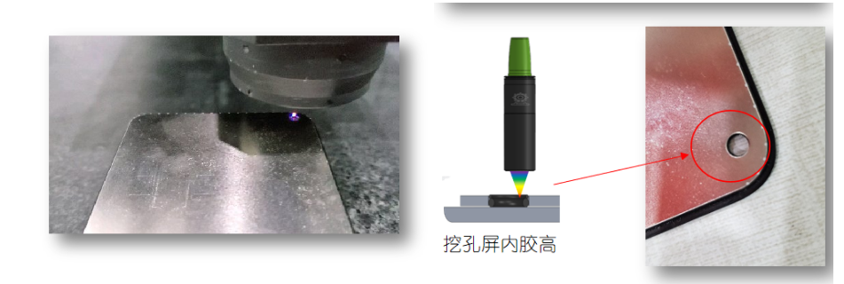 通孔”能夠有效減少屏幕層對前置攝像頭的遮擋,從而在拍照獲取光線時更有優勢。所以解決起來只需要考慮將屏幕打孔的地方和攝像頭完好銜接,此工藝對點膠的高度要求很高,如果膠高度不一致,最終屏幕的成像效果出現縫隙、銜接不自然的問題。采用光譜共焦傳感器可以很好的解決這一問題,不但可以完整測出膠的高度,同時也可以測到寬度,高速的采樣頻率,更適合自動化設備在線。