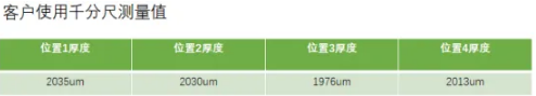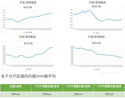 為了保證光伏花紋玻璃厚度的均勻性,我們首先在光伏花紋玻璃上選擇四個點用千分尺進行標定。方便后續計算出測量誤差是否小于30um。 再使用光譜共焦位移傳感器掃描千分尺測量位置區域,我們設置步距2um間隔取一個點,2000Hz采樣頻率,對掃描2mm區域內所有數據做平均值。 測試方式:在產品上以2um間距取點,掃描20mm距離得到厚度值,測試時花紋面朝下,且掃描方向垂直于花紋波浪方向掃描。 測試速度及設置:使用自動曝光然后在軟件設置1000Hz采樣頻率,2mm/s的運動速度,共取點10000個。