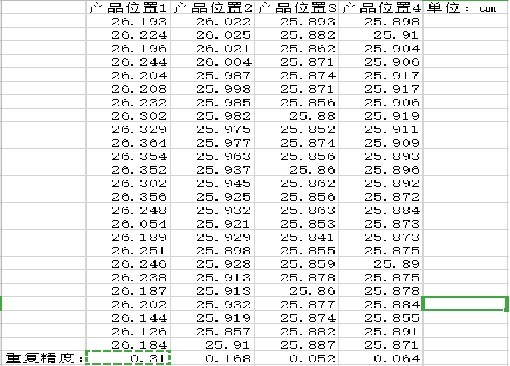 位置1重復(fù)25次的動態(tài)重復(fù)精度為0.31微米,位置2重復(fù)25次的動態(tài)重復(fù)精度為0.168微米,位置3重復(fù)25次的動態(tài)重復(fù)精度為0.052微米,位置4重復(fù)25次的動態(tài)重復(fù)精度為0.064微米。
