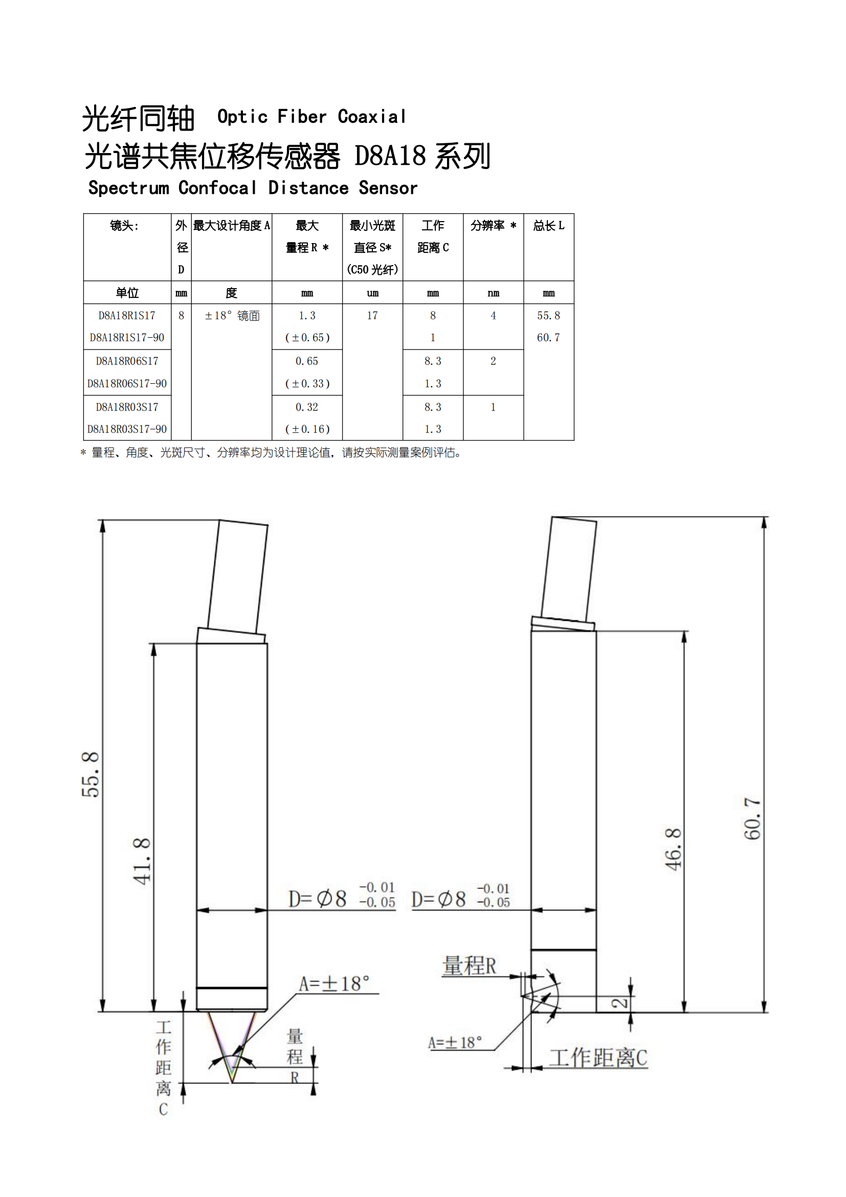 直徑8mm,小巧、經濟,可滿足絕大多數安裝場景,工作距離和量程適中,配合我司獨有的8通道控制器,可多探頭并排使用,應用于多點檢測領域,例如平面度等特性,此款擁有90度出光鏡頭版本,可深入各種小孔內部測量內壁尺寸特征