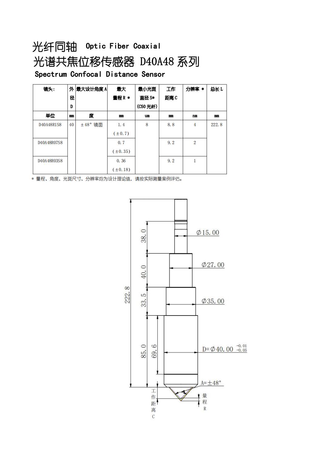 直徑40mm,適中尺寸可滿足大多數安裝場景,小光斑特性,分辨率和測量精度為偏上級,角度特性提升到±48°,可以最大程度上滿足大角度應用場景,比如,圓弧面掃描應用等