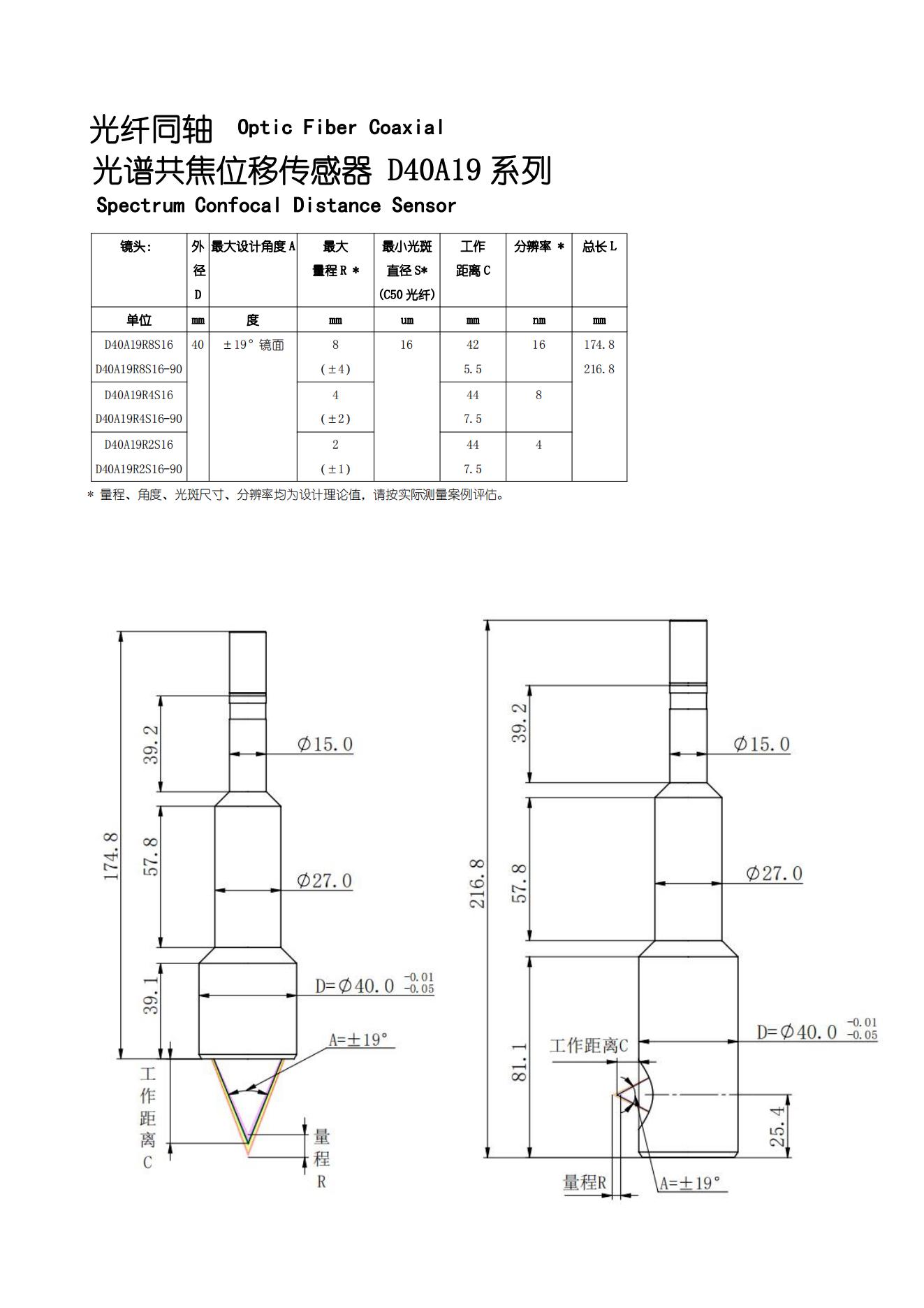 性能特性與D40A17相近,長度略長,角度性能更大,直徑40mm,適中尺寸可滿足大多數安裝場景,此款擁有90度出光鏡頭版本,可用測量側面尺寸