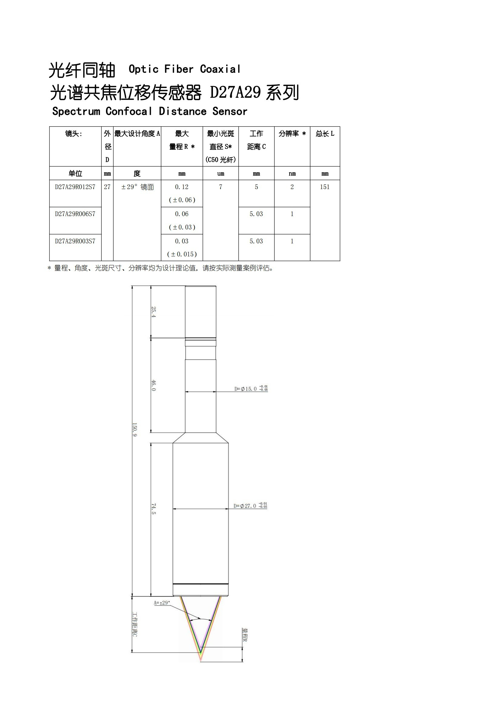 鏡頭:外徑D最大設(shè)計(jì)角度A最大量程R *最小光斑直徑S*(C50光纖)工作距離C分辨率 *總長(zhǎng)L單位mm D27A29系列:直徑27mm,角度±29°