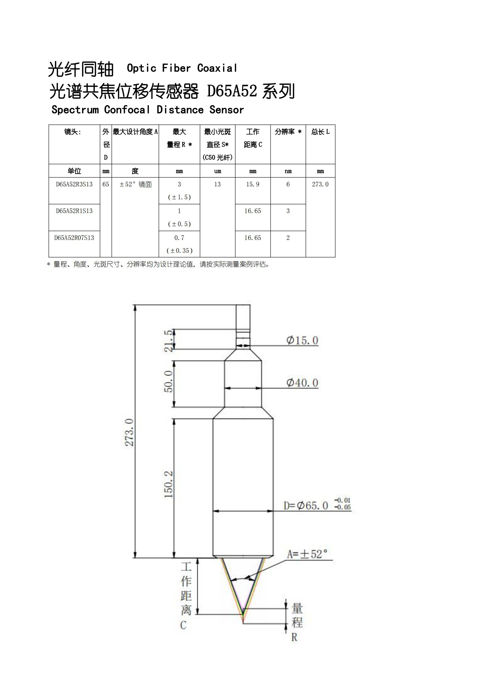 鏡頭:外徑D最大設計角度A最大量程R *最小光斑直徑S*(C50光纖)工作距離C分辨率 *總長L單位mm D65A52系列:直徑65mm,角度±52°
